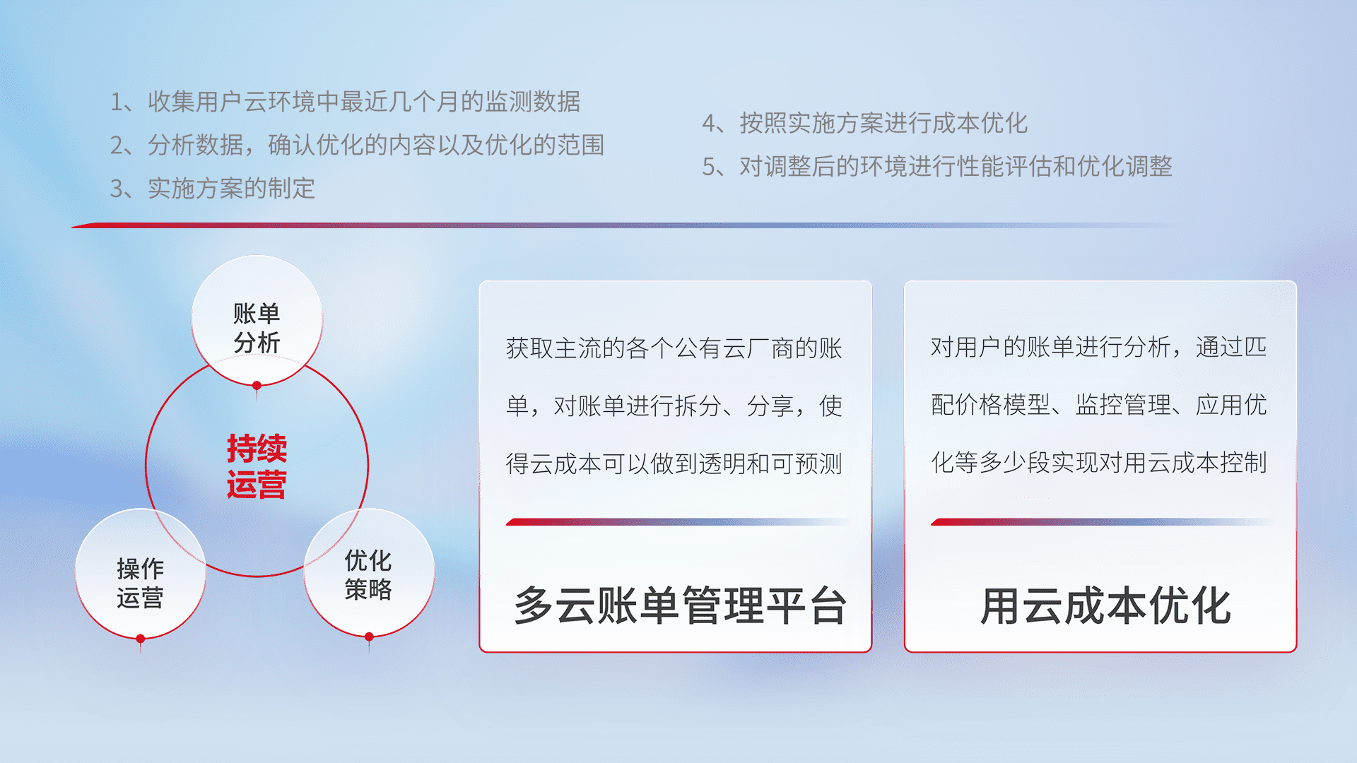 通过多云纳管,,,,以统一的资源数据模型把客户的云资源进行抽象和封装,,,,进而实现对多云资源的统一操作,,保障云资源管理的可靠性、、、稳定性与可用性。。。量身定制化运维内容,,,配置、、开发运维、、补丁管理、、、、备份、、、监控、、、、认证和访问管理、、、审计和日常巡检等,,,,保障在用云过程中的可靠度,,,稳定度以及高可用率。。。。
